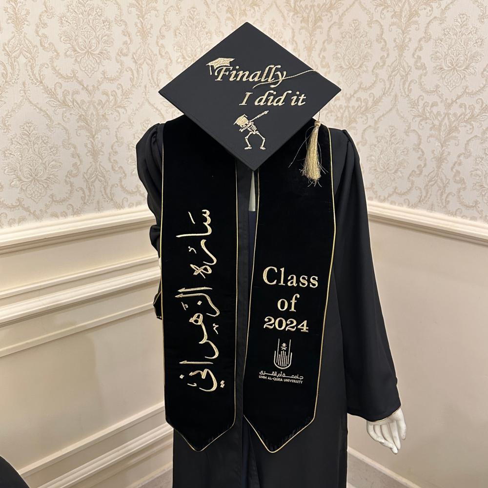 المنتج عبارة عن طقم يشمل روب التخرج والوشاح مع التطريز والقبعة